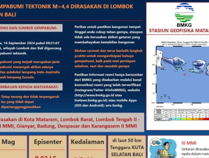 AKSESPUBLIK.COM– Badan Meteorologi Klimatologi dan Geofisika (BMKG) mencatat gempa bumi 4,4 magnitudo dirasakan di wilayah Bali dan Lombok, Nusa Tenggara Barat (NTB) pada pukul 09.31 WITA, Sabtu.